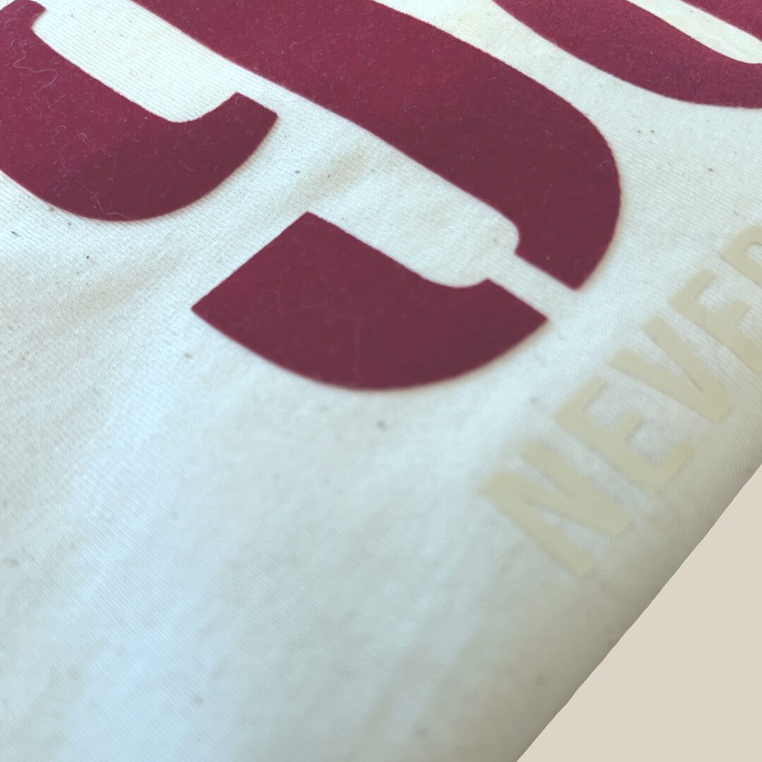 • niet strijken op bedrukkingen